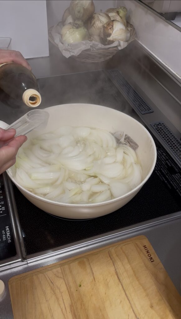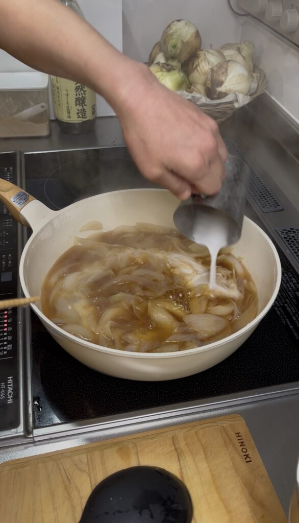 3. 新玉ねぎが少し柔らかくなったら、調味料を入れ、中火で5分ほどクツクツ。