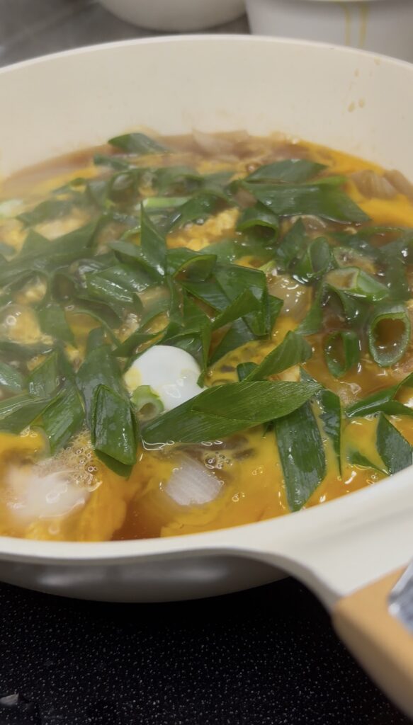 5. 溶き卵をふちから全体に回しかけ、青ねぎを散らす。
