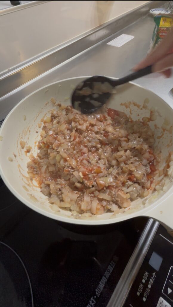 3. トマト缶を加えて混ぜ、味噌・砂糖・塩で味を整え、5分ほど煮込む。