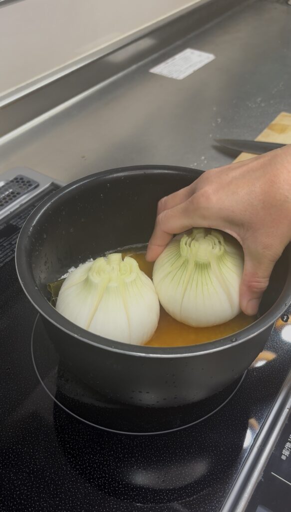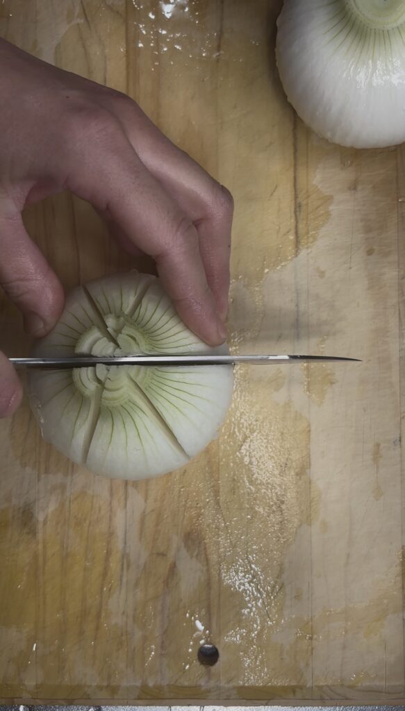 新たまねぎは十字に3本ほど切り込みを入れる。