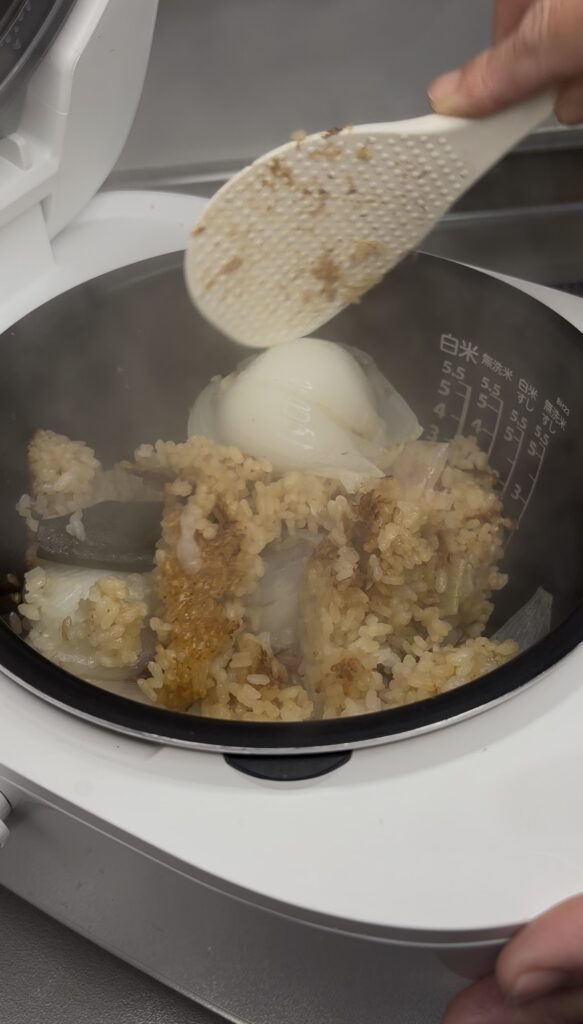 4.新玉ねぎをくずしながら、底からご飯をすくって切り混ぜる。