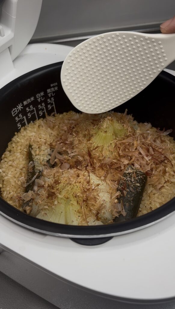 3.炊き上がったらかつお節を加える。