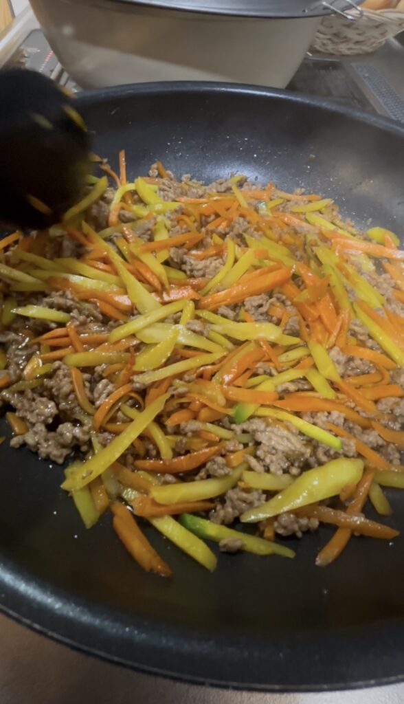 3. にんじんと合いびき肉を炒める。