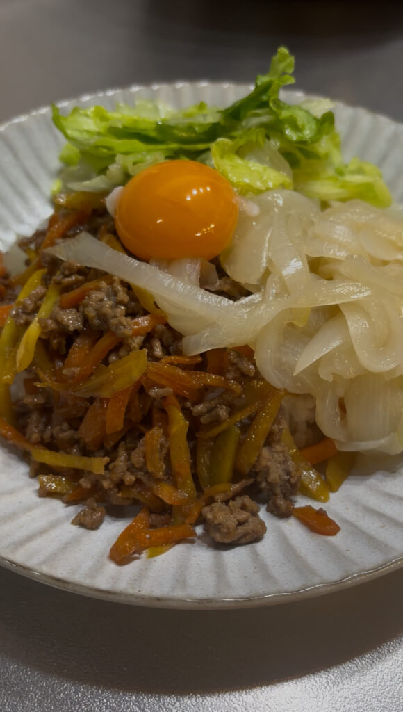 6. 温かいごはんに具をのせ、仕上げに卵黄と海苔をのせたら完成。